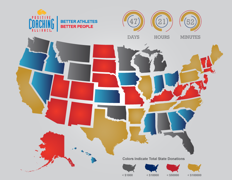 Positive Coaching Alliance is a national non-profit developing “Better Athletes, Better People.” PCA works to provide youth and high school athletes with a positive, character-building youth sports experience. This infographic was intended to promote a state by state donation drive to promote local youth sports teams. The states with the most donations would win prizes for their sponsored teams.